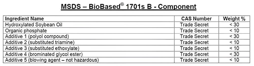 On the image you may observe that “Hyrodxylated Soybean Oil” is 30% of component B, and in fact, just 15% of the completed foam blend (component A will dilute the mixture to a 50/50 ratio). You may also observe that 15% of the final mixture will be polyol blend. So, this new ‘soy based’ foam is not completely soybean oil based foam, it still has substantial levels of polyols.